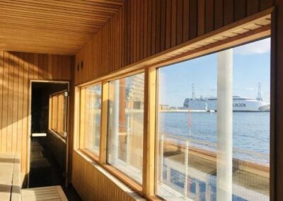 Vi bader i Havnebadets runde bassin, har adgang til to store saunaer, toiletter samt indendørs og udendørs omklædningsrum. Badetøj er påkrævet i bassinet og i saunaen.
